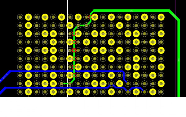 첨부 그리을 보시면, 녹색 라인과 파란색 라인이 모두 inner layer에서 라우팅되는데, 녹색 라인에서만 clearance에서 에러가 발생합니다. (파란색 라인은 에러가 없습니다. line width 는 모두 동일하게 10mil입니다.)