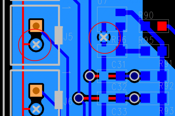 그리고 오른쪽 동그라미 via는 Thermal이 생성됐는데, 왼쪽 동그라미인 부품 쪽 GND는 Thermal이 생성되지 않았습니다.
