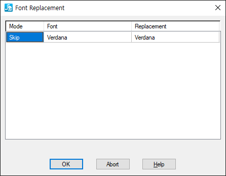 다른 PC에서 설계한 파일에 사용된 폰트가 현재 PC에 없는 경우 현재 PC에 설치 된 폰트로 변경할 수 있는 창입니다.