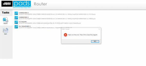 pcb data를 router에서 불러오면 fatal run-time error. Press OK to close the program 이란 에러 문구가 뜹니다.