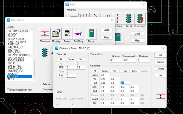 디자인룰-DECAL-TP선택-PAD TO PAD 0.7mm만 셋팅하여 Verify Design-clearance 에러 검출을 하고자 하는데 TP간 에러 표시가 안되서 문의드립니다. 첨부 설정과 다르게 별도 셋팅이 필요한 부분이 있을까요???