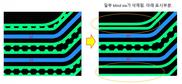 이때 고주파 주변 GND plane에 추가했던 blind via들이 삭제됩니다.