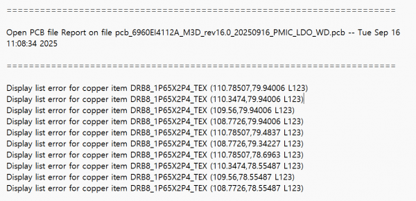 제목과 같이 PCB 파일을 열면 Display list error for copper item Error가 발생합니다.