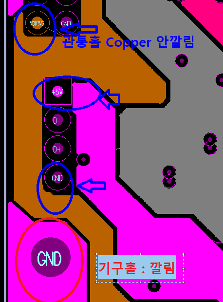 관통홀에 카퍼가 적용이 안되고 있습니다.