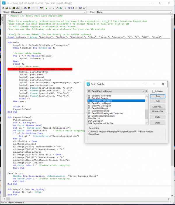 Basic Scripts 가 열리길래 되는줄 알았더니... 17-Excel Part List Report를 Run 하게 되면 Macro 창이 열리고 엑셀파일이 열리지 않습니다 ㅠㅠ.. PADS Layout VX2.8 버전 사용중인데 방법이 있을까요??