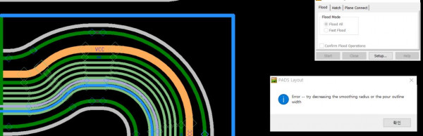 [Tools]-[Options]-[Copper Plane]-[Hatch and Flood]의 Smoothing radius 값을 0으로 변경