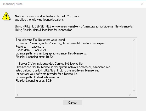 이전에 구매했던 PADS(USB 동글타입)에서 첨부파일과 같은 에러 메시지가 출력되면서 데모버전으로 실행됩니다.